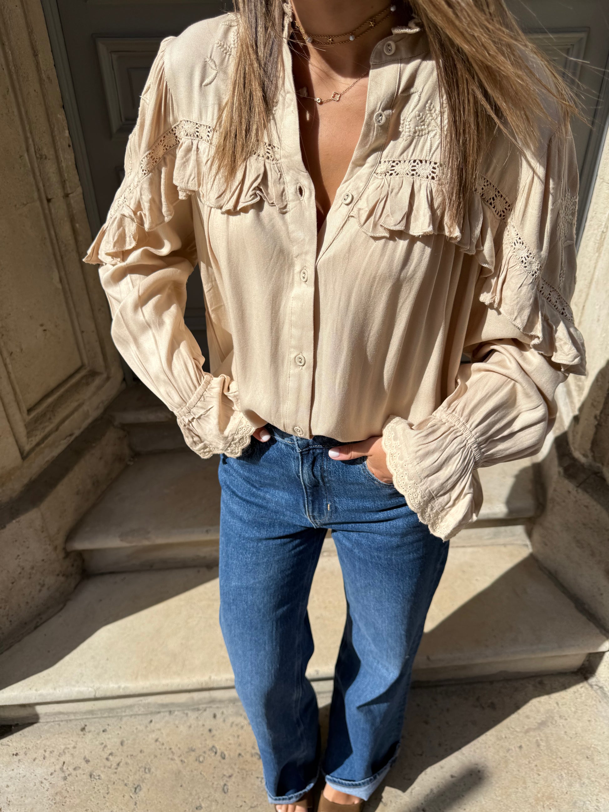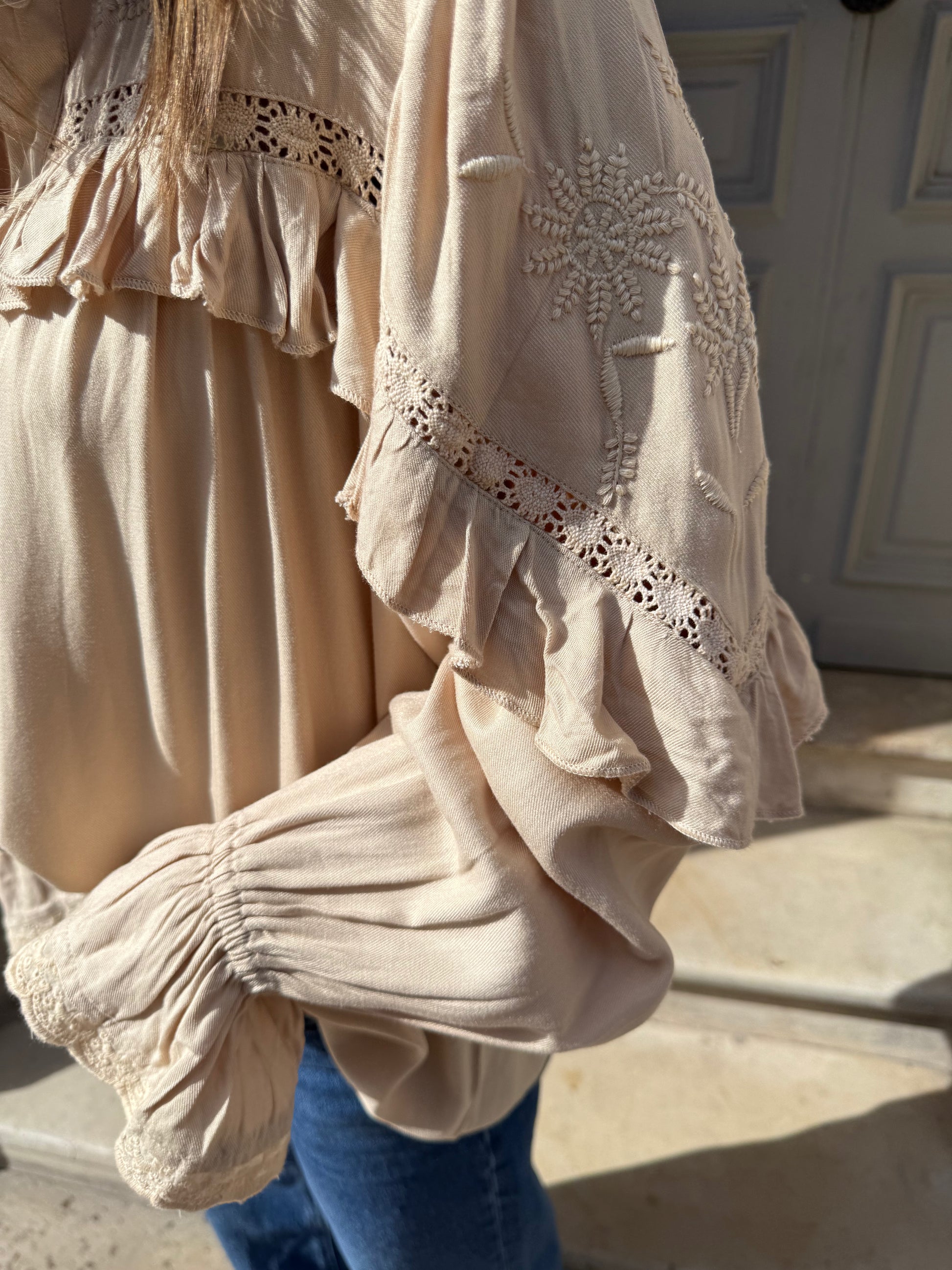 La blouse Diane est un essentiel à avoir dans votre garde-robe. Sa teinte sable délicate est sublimée par de fines broderies et des volants élégants, qui apportent une touche de féminité et de raffinement. Cette pièce légère et sophistiquée rehausse instantanément votre style, parfaite pour toutes les occasions où vous souhaitez allier élégance et modernité.