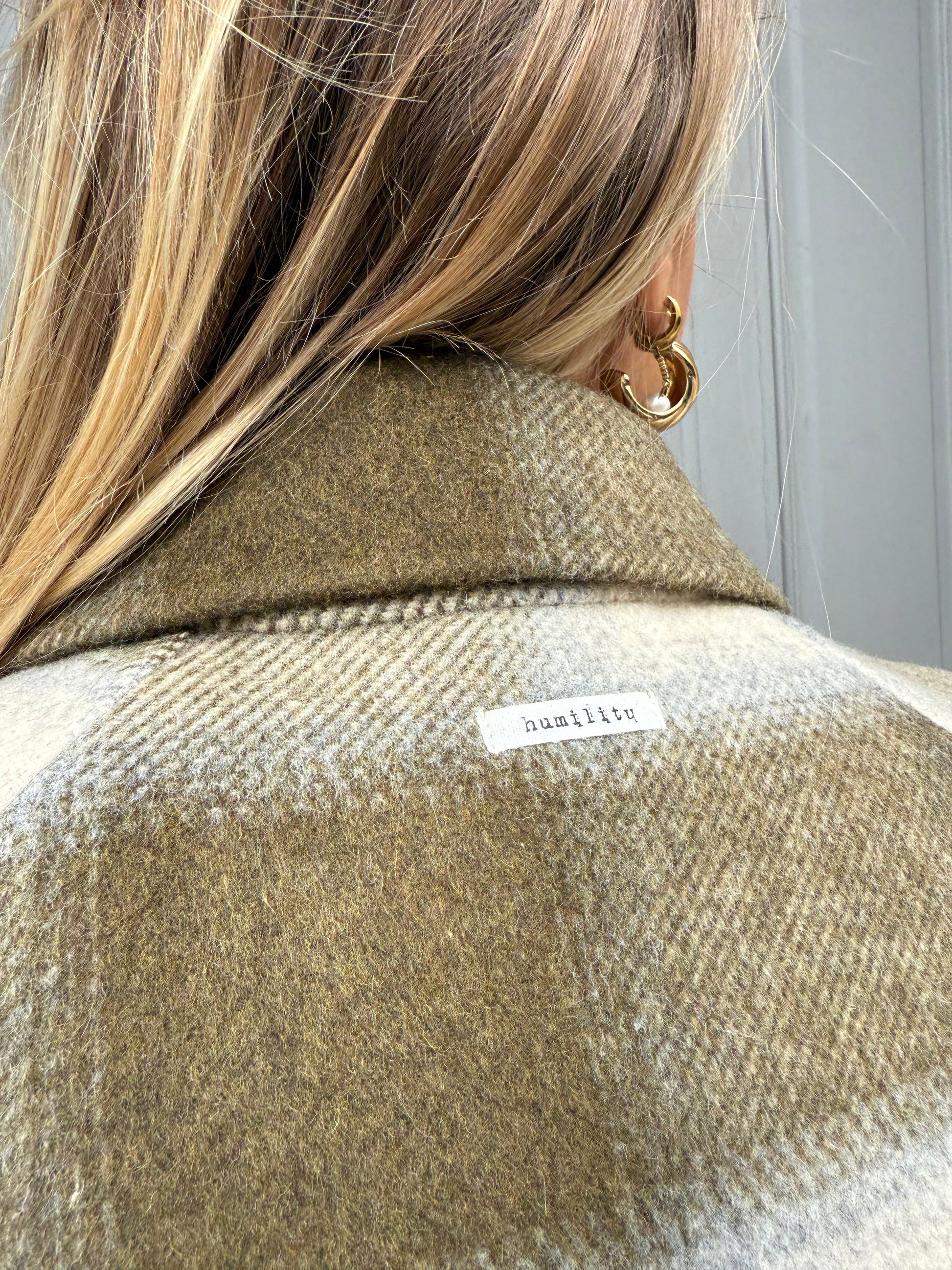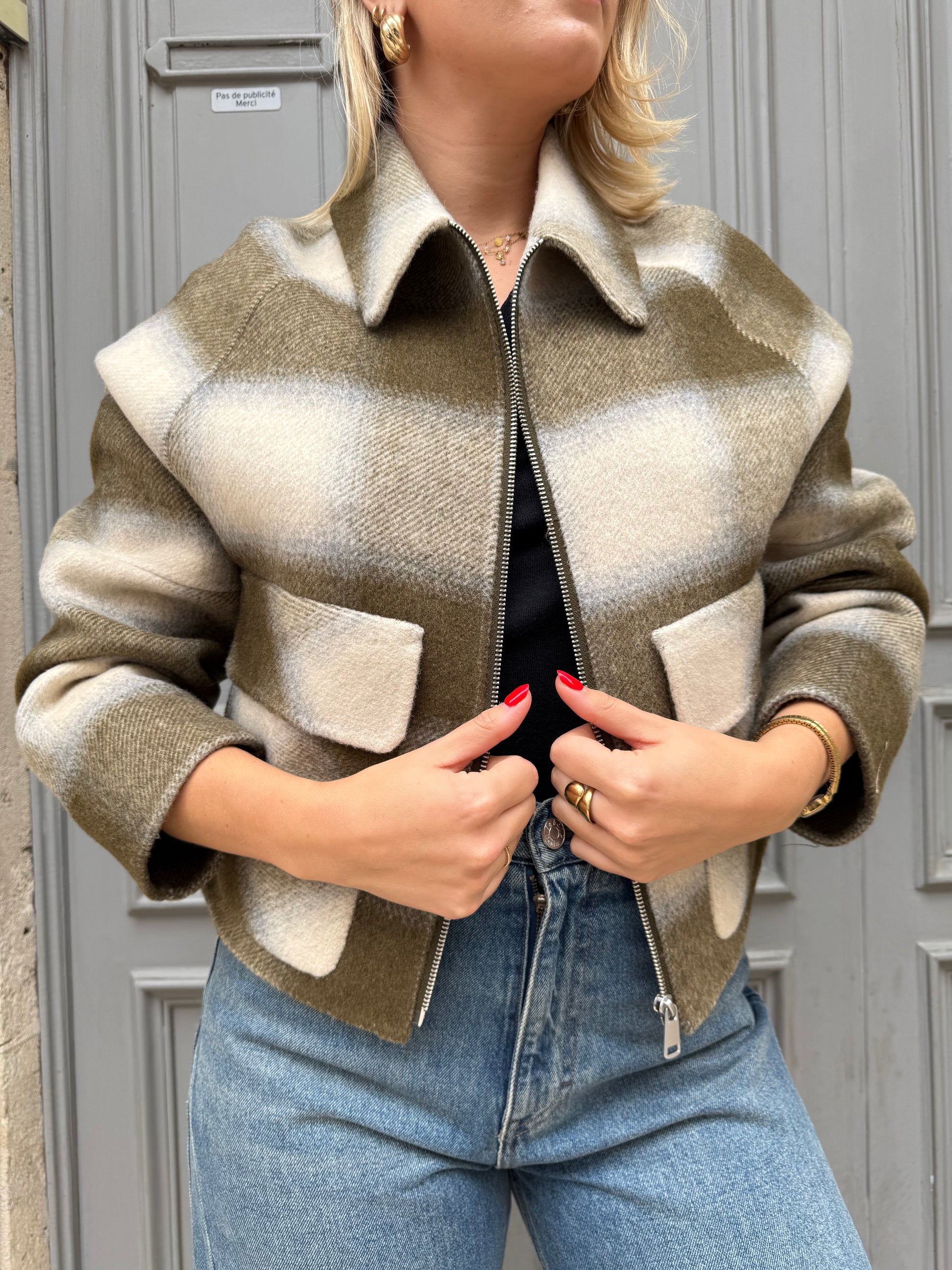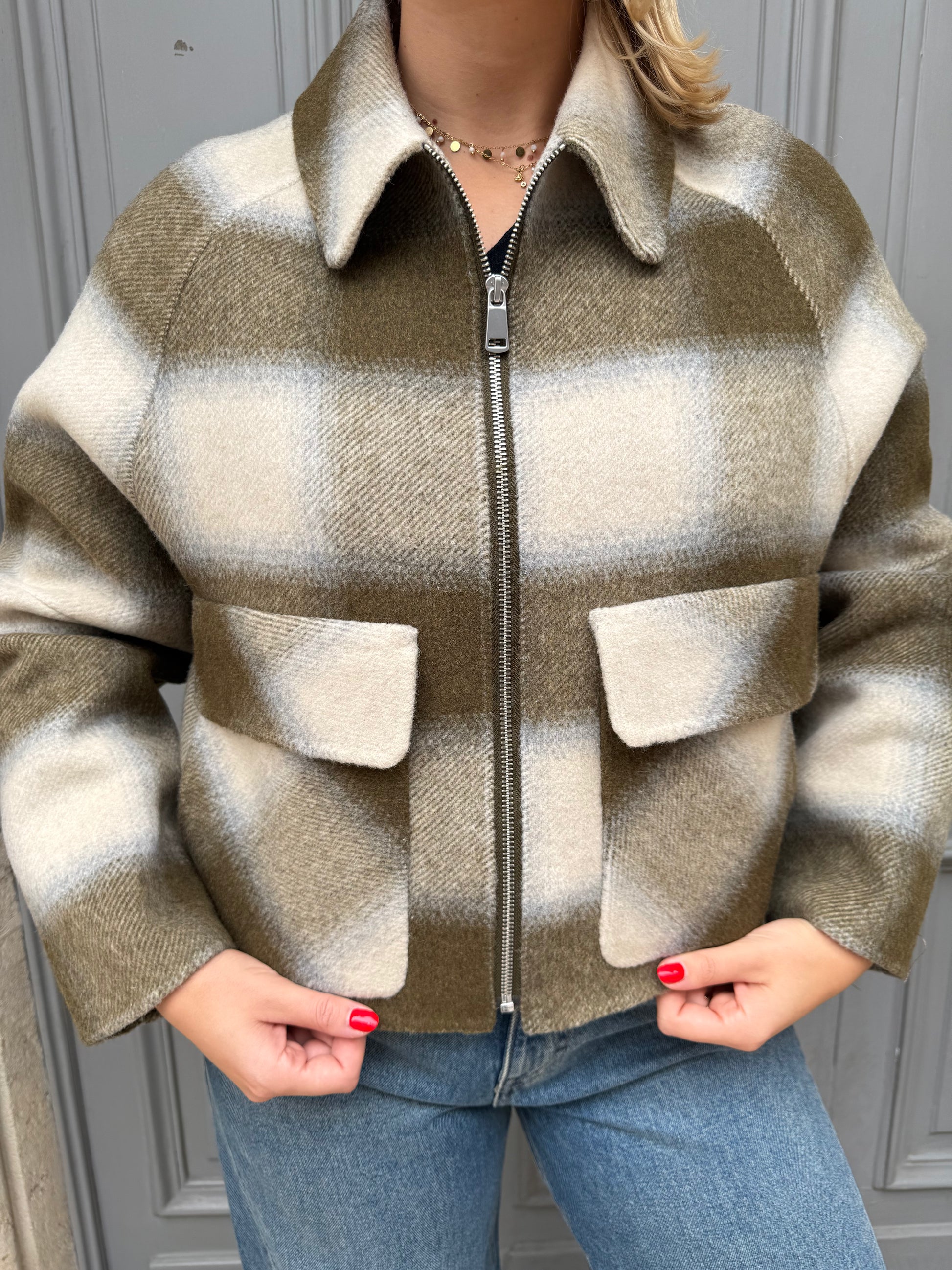 Le blouson Humility vous offre un équilibre parfait entre confort et style avec sa laine mélangée douce et sa doublure intégrale. Son motif carreaux tie and dye kaki et blanc apporte une originalité subtile à votre look.