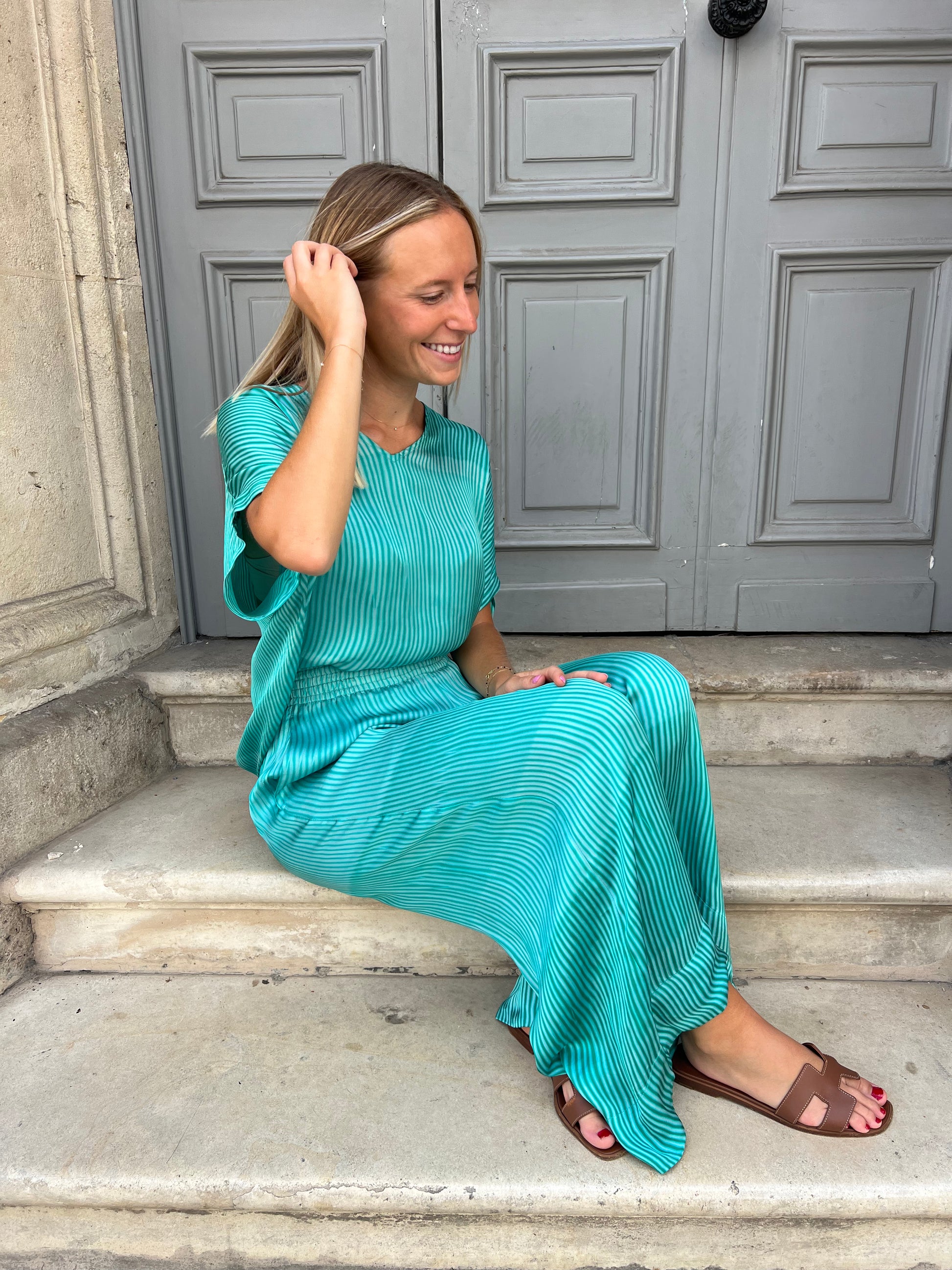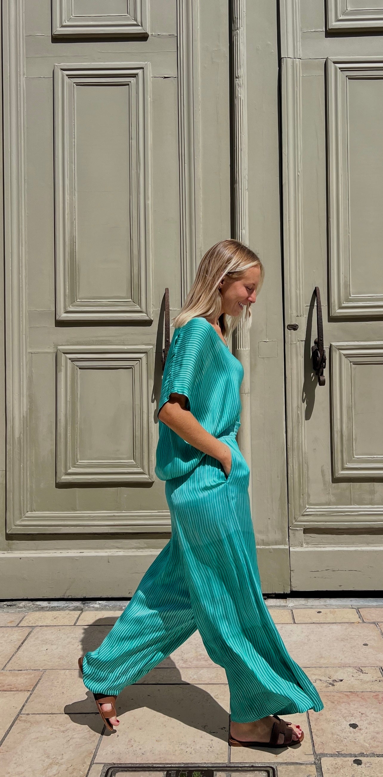 Le pantalon FAUSTINE de NOUS allie élégance et légèreté. Confectionné dans un tissu fluide aux délicats tons verts, il offre une silhouette raffinée tout en garantissant un confort optimal grâce à sa taille élastique discrète.